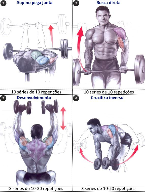 Nº de séries: 10 séries por exercício para os grupos musculares principais. 3 séries para grupos musculares secundários.